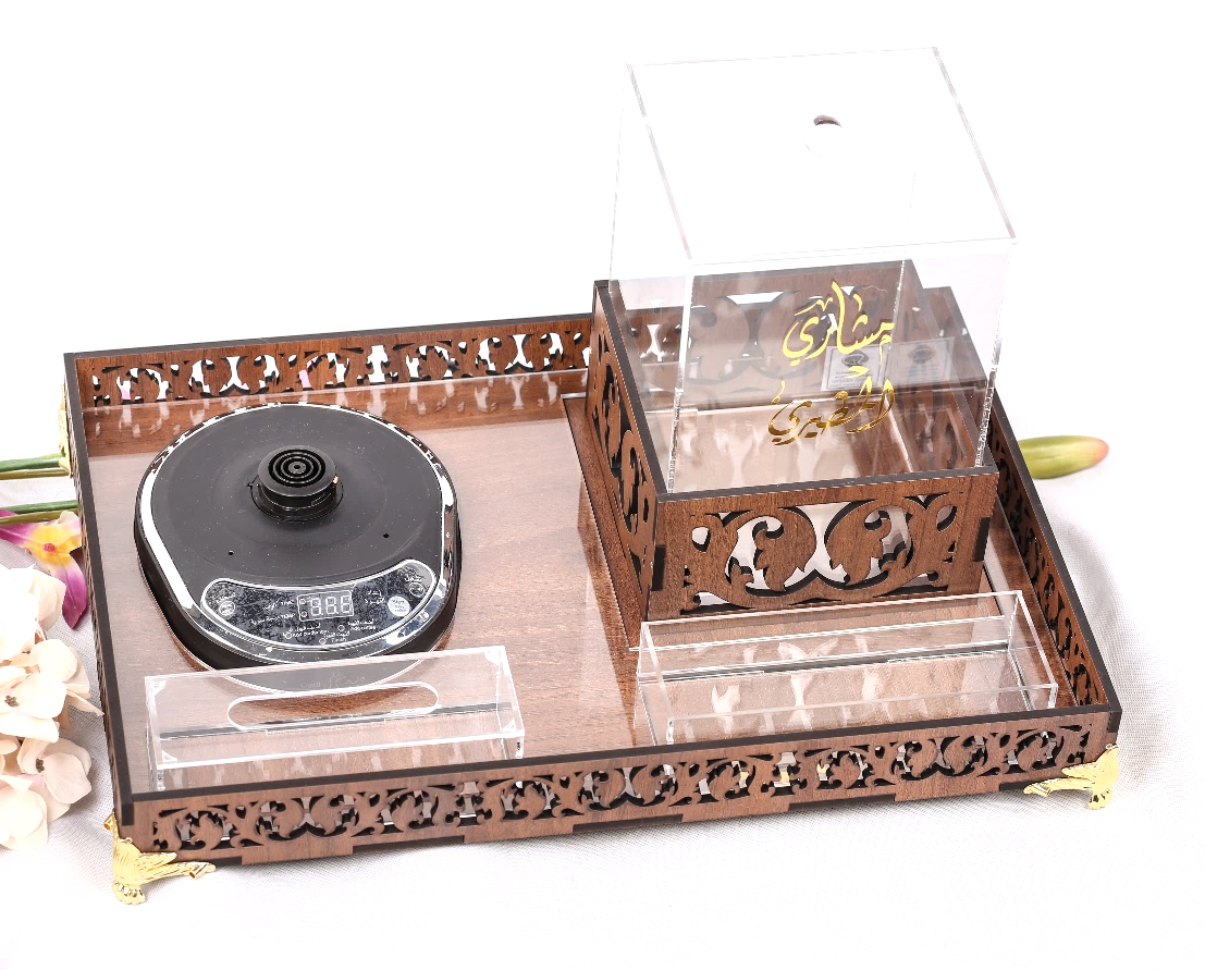 صينية خشب للقهوة تحتوي على بكس حلو و علبة كلسنك وعلبة الفناجين طول 48 سم, عرض 32, ارتفاع 6سم .