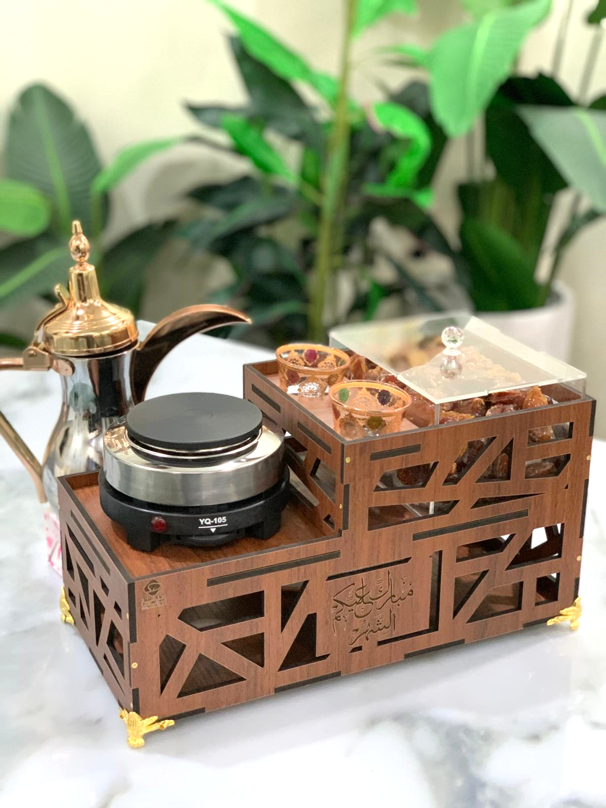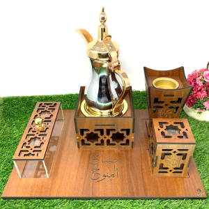 قاعدة دلة خشب (الطول 36 سم, عرض 18 سم, ارتفاع 18 سم) مع علبة للحلو (طول 17 سم عرض13 ارتفاع 10سم) مع أمكانية حفر الأسماء