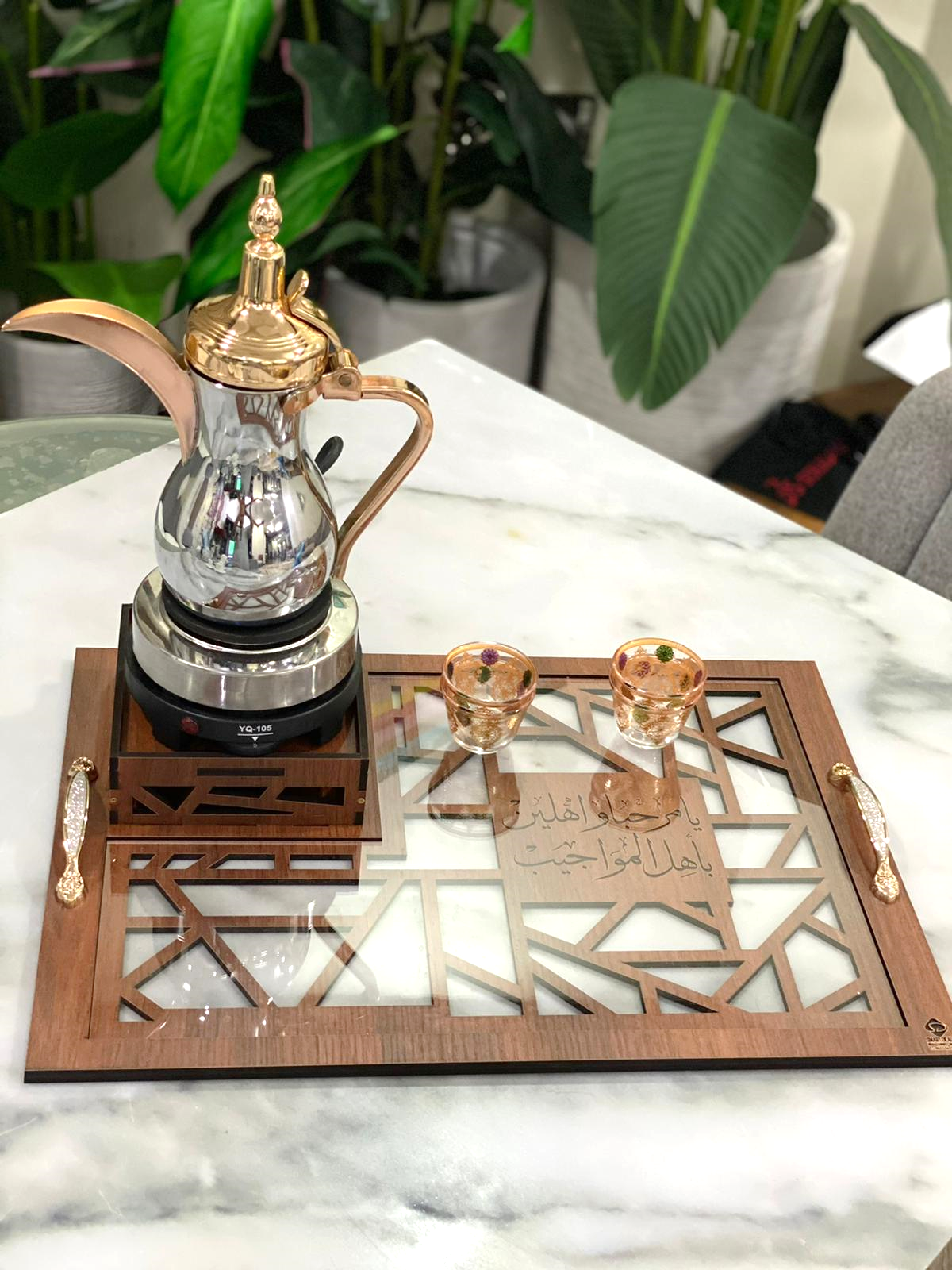 صينية خشب وأكريليك (طول 50 سم عرض 35 سم ارتفاع 6 سم) مع قاعدة دلة - سخان كهرباء مع أمكانية حفر الأسماء والعبارات –
