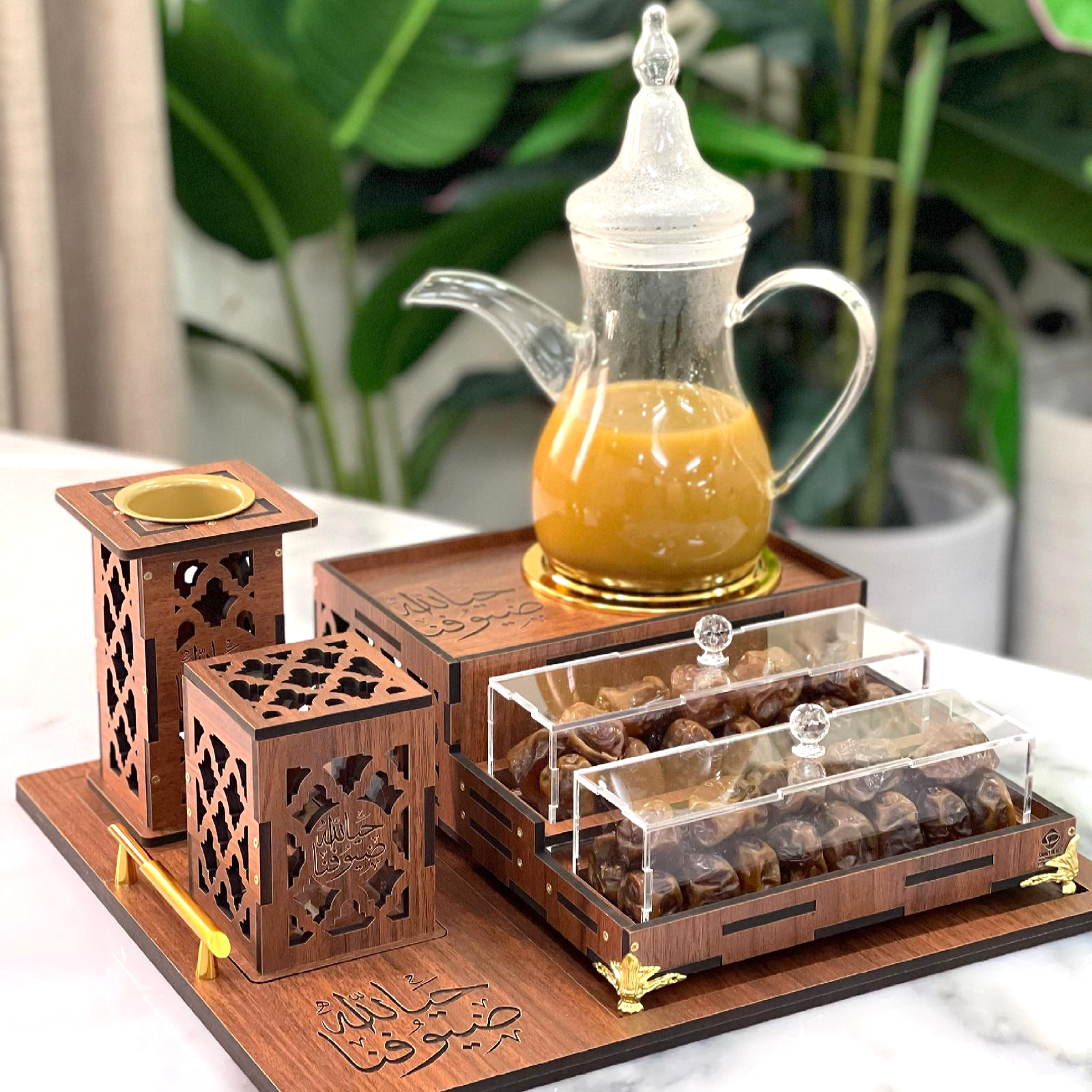 صينية مبخر خشب (طول 40 سم عرض 35) تحتوي على قاعدة دلة (32 سم طول عرض 23 سم) مع مبخر ارتفاع 15 سم وعلبة بخور مع أمكانية حفر الأسماء والعبارات على القطع –