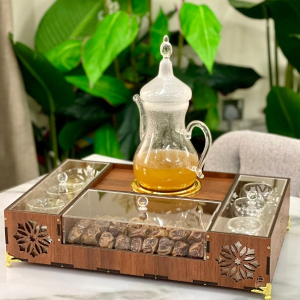 صينية خشب (الطول 40 عرض 35) تحتوي على قاعدة دلة (32 سم طول عرض 23 سم) مع علبتين للحلو (طول 20 عرض 6 سم ارتفاع سم) مع أمكانية حفر الأسماء على القطع