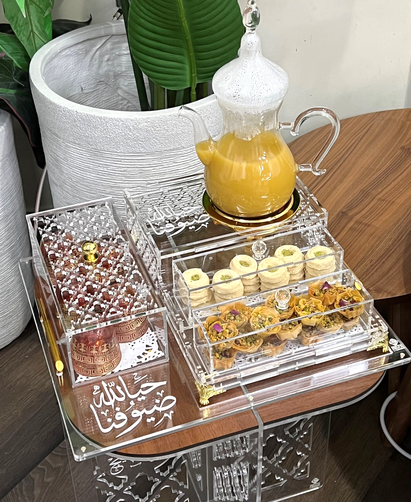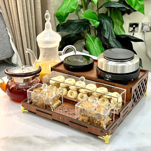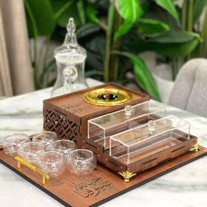 صينية خشب (الطول 40 عرض 35) تحتوي على قاعدة دلة (32 سم طول عرض 23 سم) مع علبتين للحلو وبوكس أكريلك (23 سم عرض 12 سم ارتفاع 8 سم)مع أمكانية حفر الأسماء على القطع