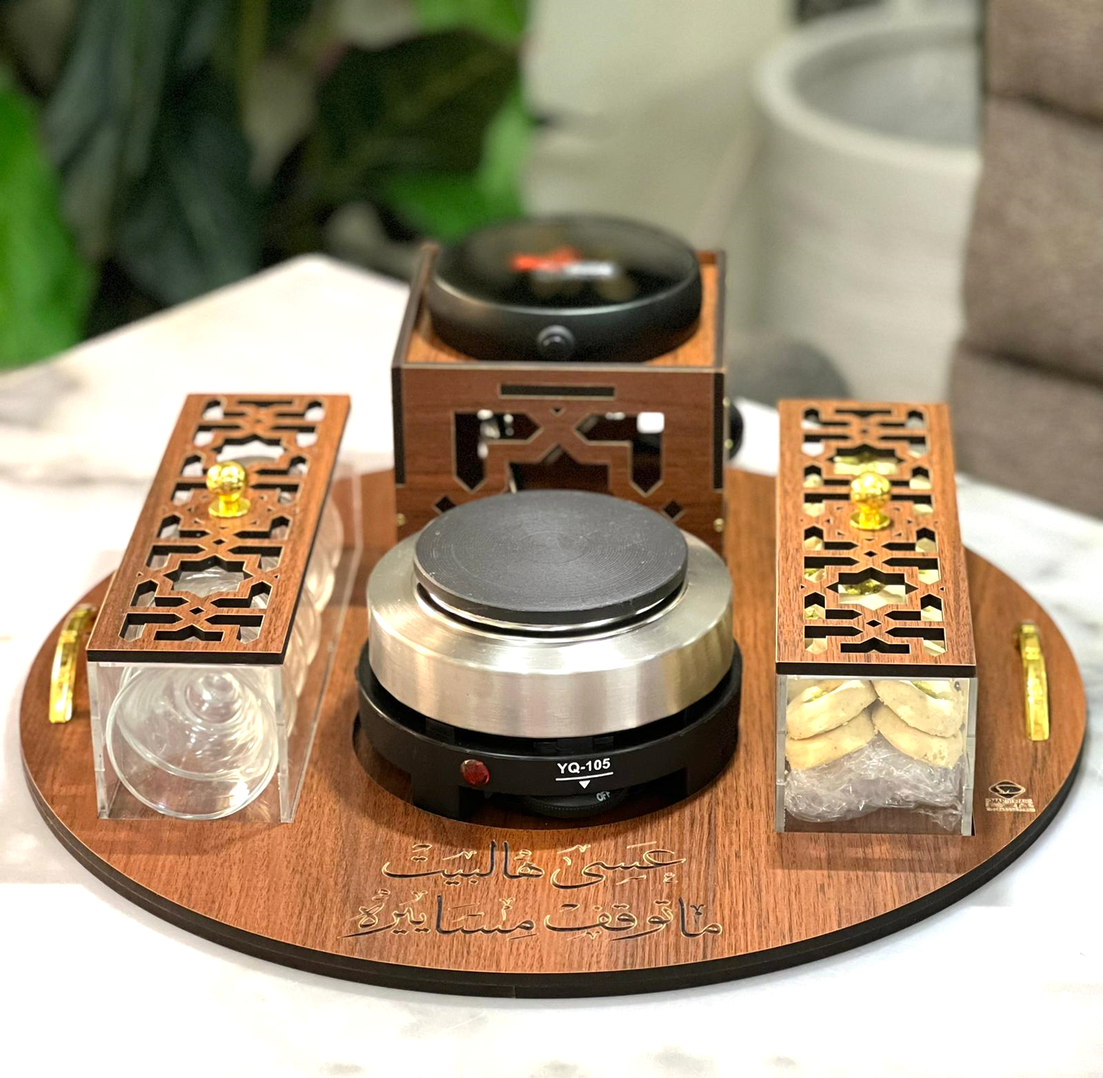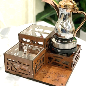 صينية خشب (قطر 40 سم) مع قاعدتين كهربائيتين للشاي والقهوة تتضمن علبتين للحلو(22سم طول -عرض 7 سم -ارتفاع 7) مع أمكانية حفر الأسماء والعبارات -