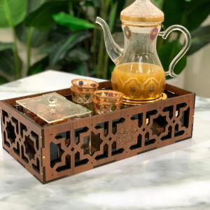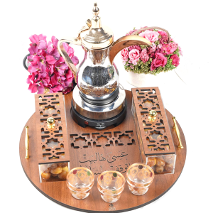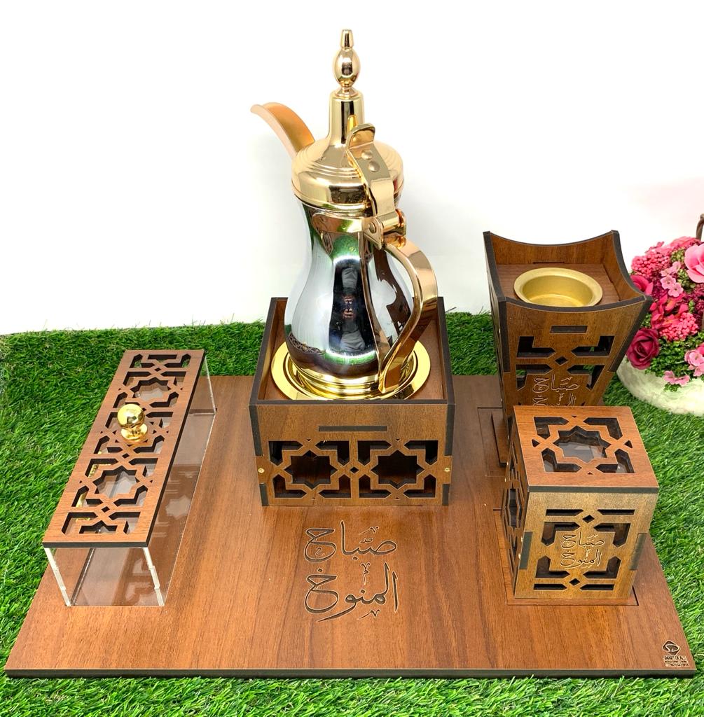 صينية خشب) طول 43 سم عرض32سم) تحتوي مبخر ارتفاع 18 سم وقاعدة دلة وصندوق حلو وعلبة بخور مع أمكانية حفر الأسماء على القطع