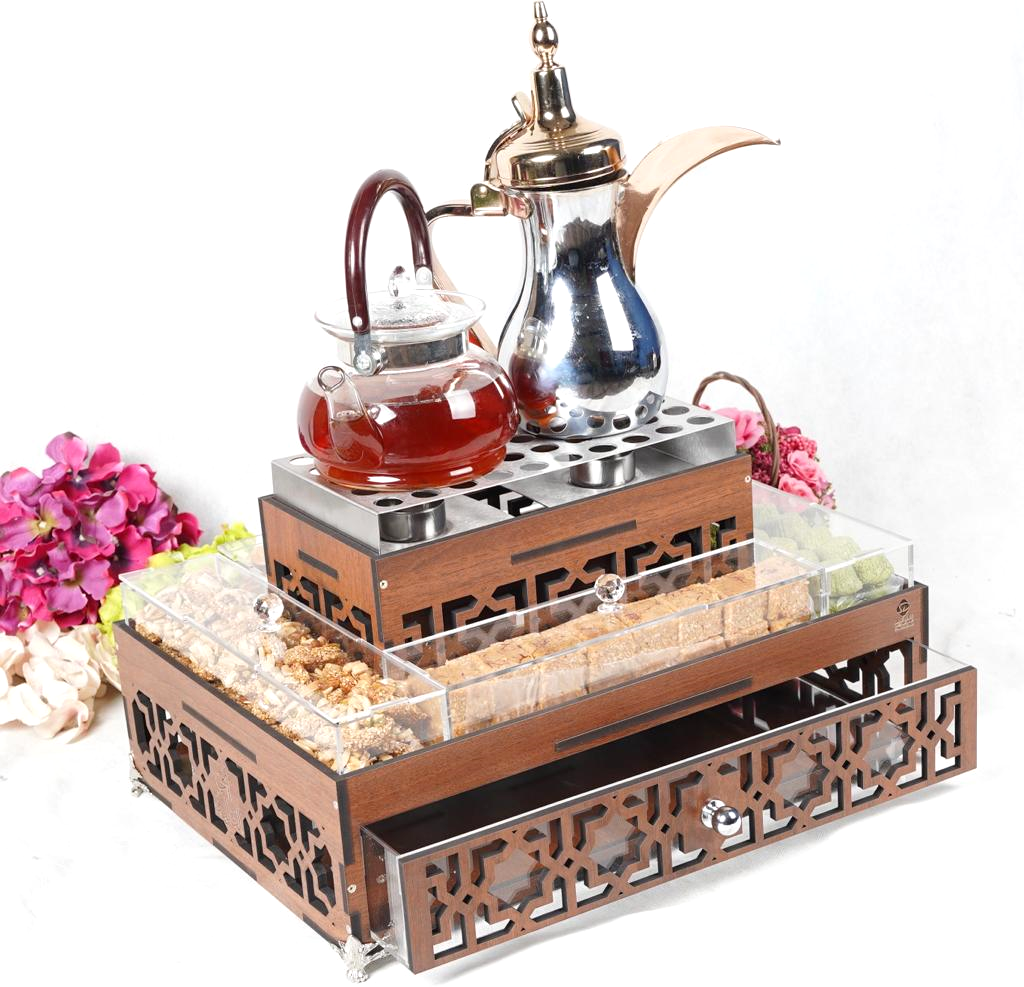 صندوق خشب) طول 41 عرض 30 ارتفاع 24 (يحتوي على قاعدة دله ذات شمعتين واربع علب أكريليك وجرارة