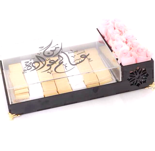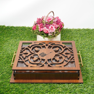 صندوق خشب مع علبة اكريلك طول 28 سم, عرض 26سم, ارتفاع 8,5 سم .