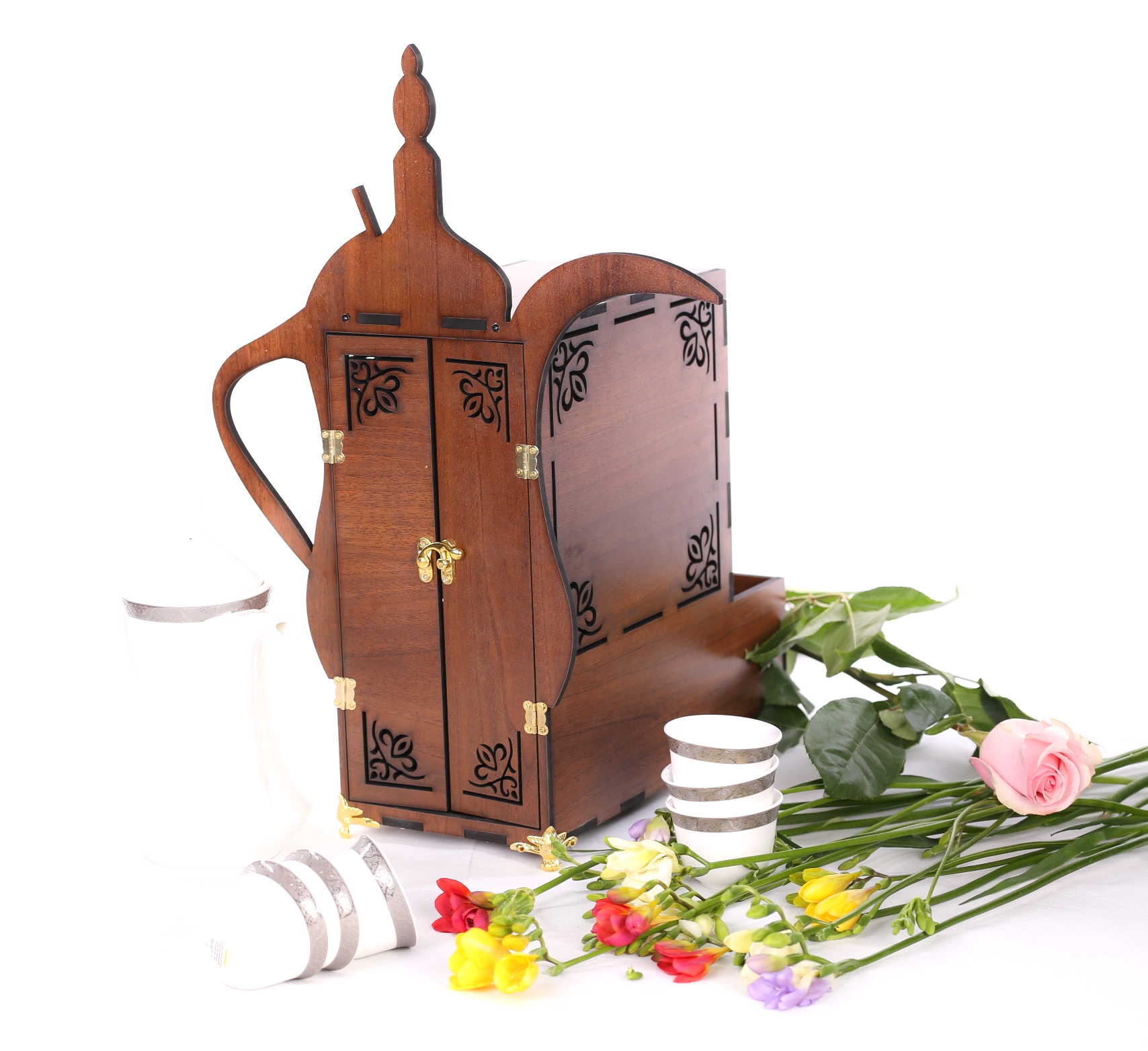 صندوق خشب تصميم دلة طول 31 سم ، عرض 16 سم ، ارتفاع 49 سم مع امكانية حفر الأسماء والعبارات.