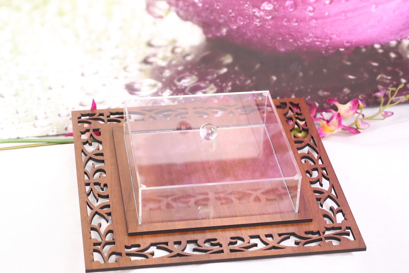 صينية خشب مع صندوق أكريلك بالمنتصف طول الصينية 36 سم وعرضها 36 سم . قياسات الصندوق الأكريليك (طول 21 سم عرض 21 سم ارتفاع 6 سم)