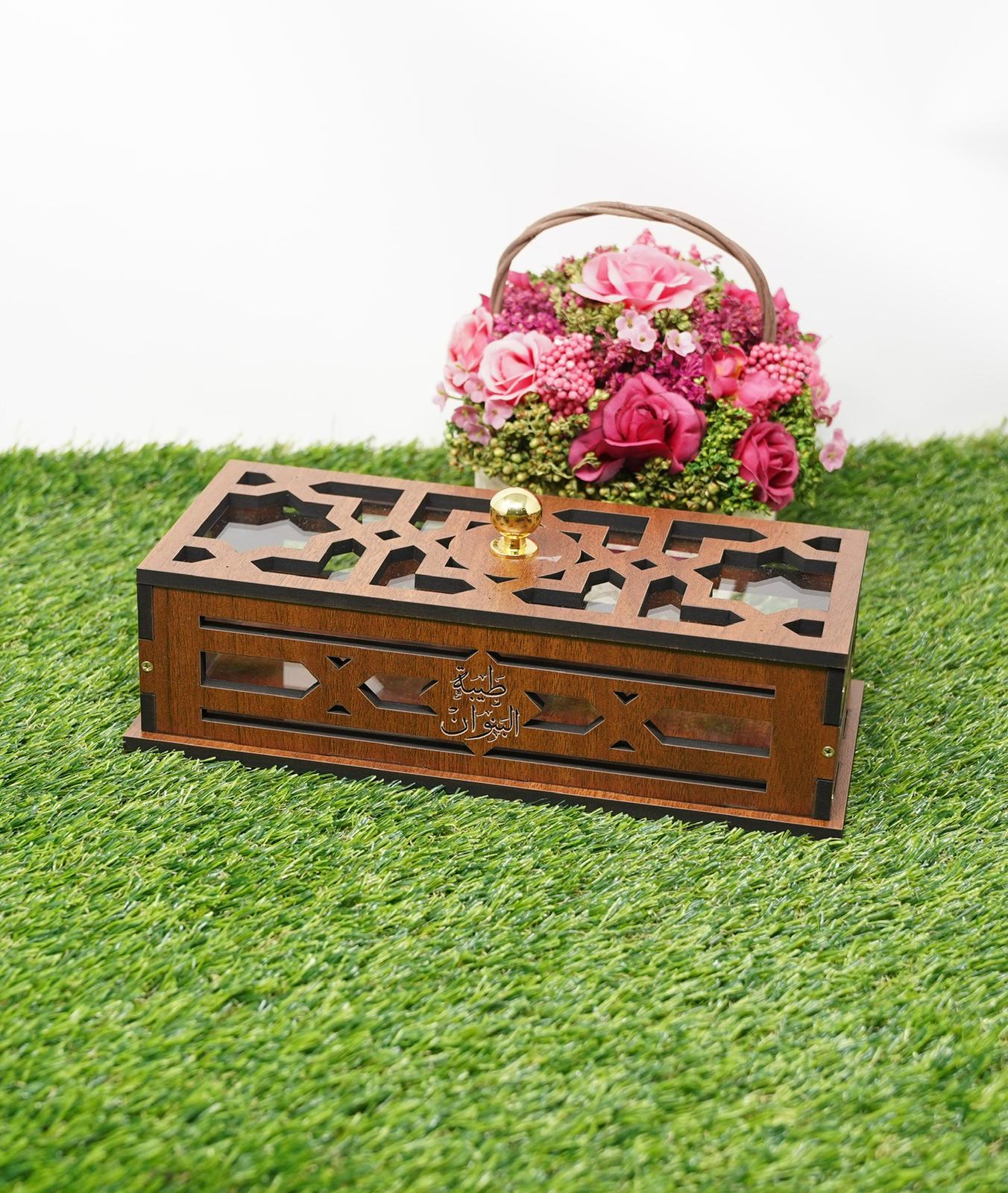 صندوق حلو مصنوع من الخشب ومن الداخل أكريلك مع أمكانية حفر الاسم (طول 26 سم – عرض 11 سم ارتفاع 6.5)
