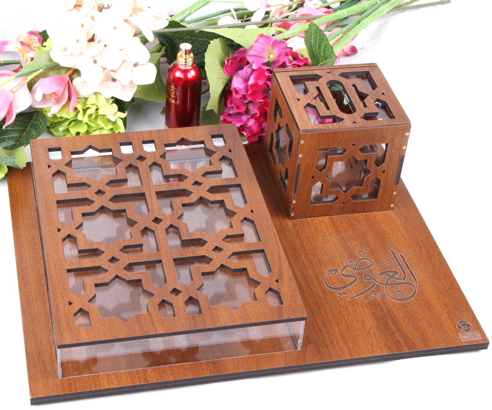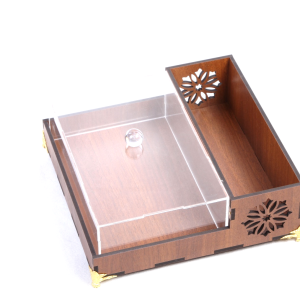 صينية خشب قياس (48*37) تحتوي على علبة كلينكس و صندوق أكريلك للحلو قياس (33*25 ارتفاع 5 سم) مع أمكانية حفر الأسماء -