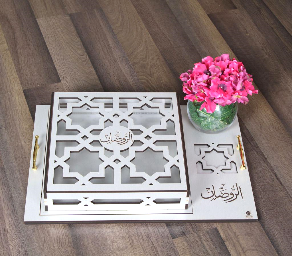 صينية خشب (طول49 عرض 35سم) مع فازا و بوكس الحلو (30 في 30 ارتفاع 7 سم) مع أمكانية حفر الأسماء على القطع