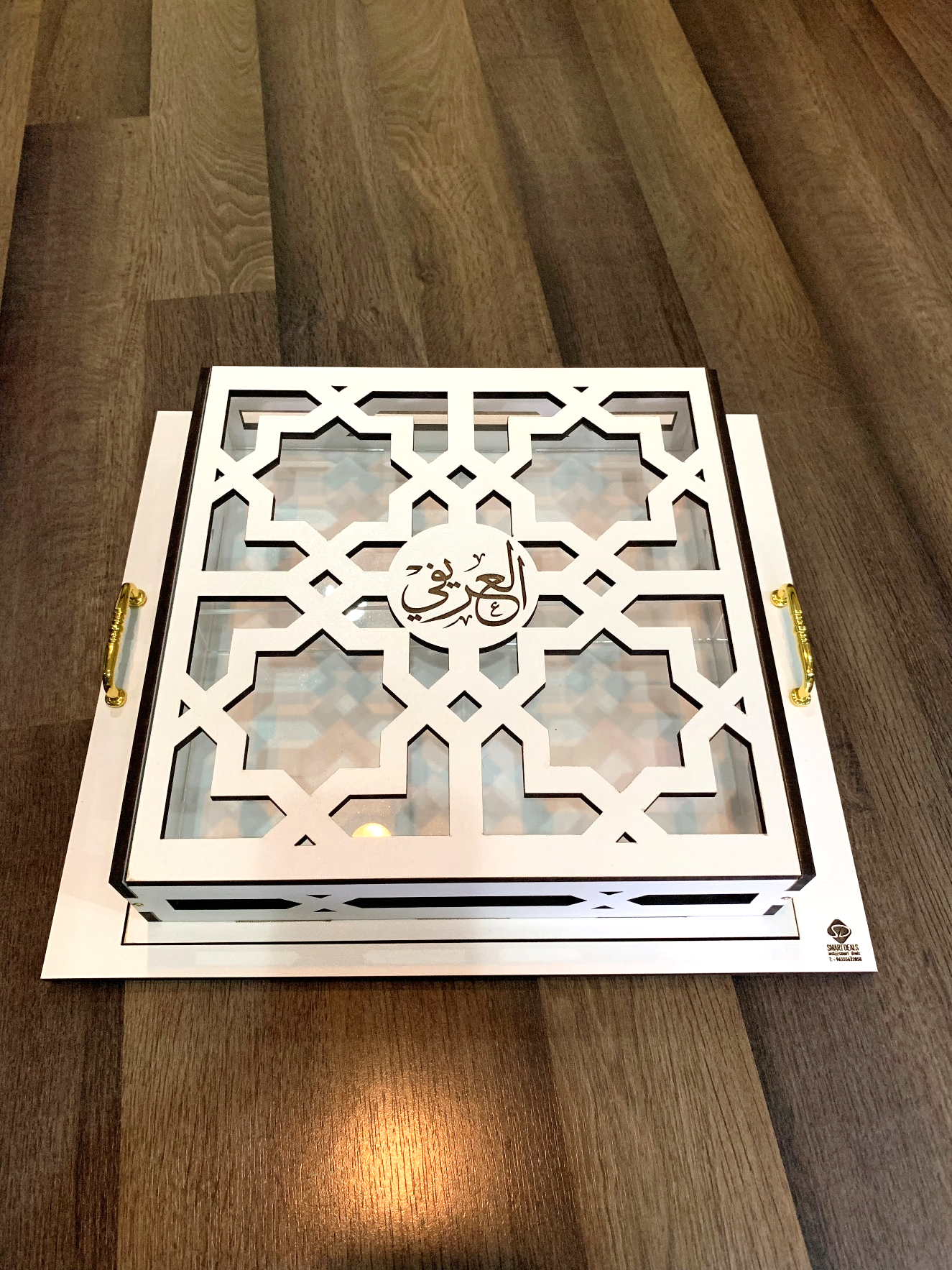 صينية خشب)طول 39 سم عرض 35 سم) تحتوي على صندوق الحلو (طول 30 سم عرض 30 سم ارتفاع 6.5 سم) مع أمكانية حفر الأسماء
