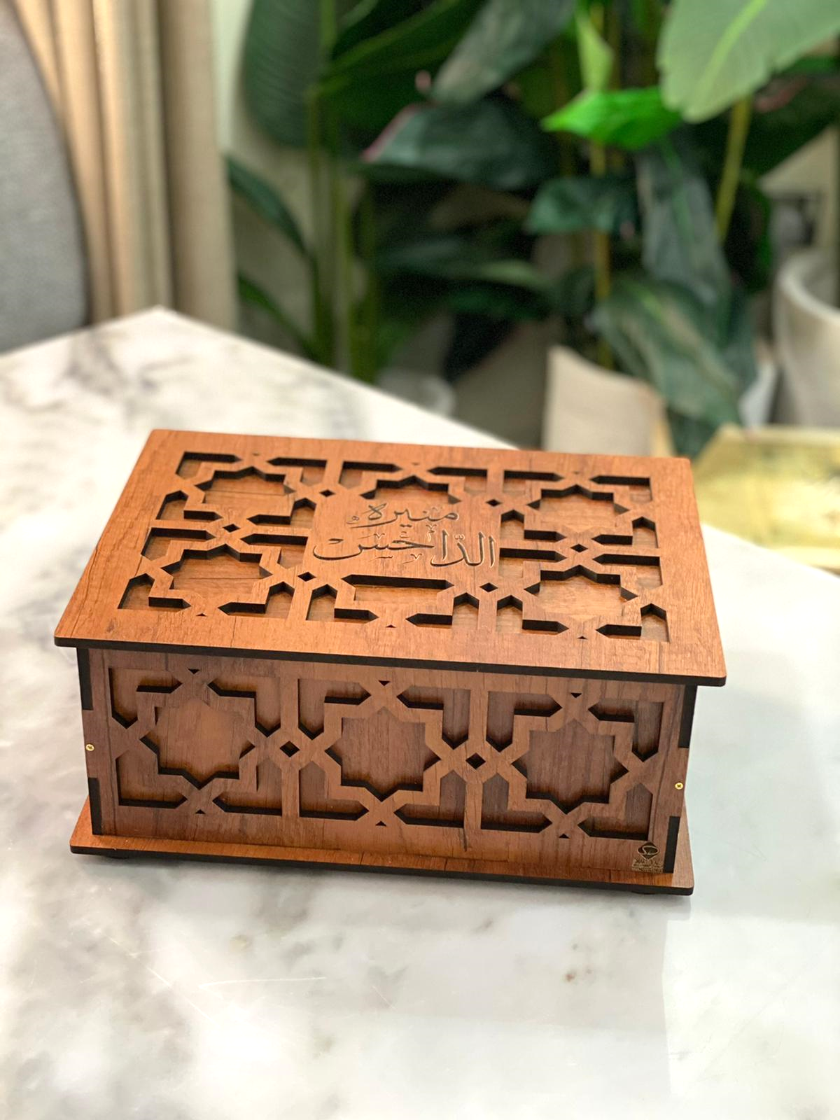 صندوق خشب طبقتين (طول 32سم عرض 24 سم ارتفاع 15 سم) كما يشمل على مبخر وعلبة للبخور مع أمكانية حفر الأسماء على القطع –