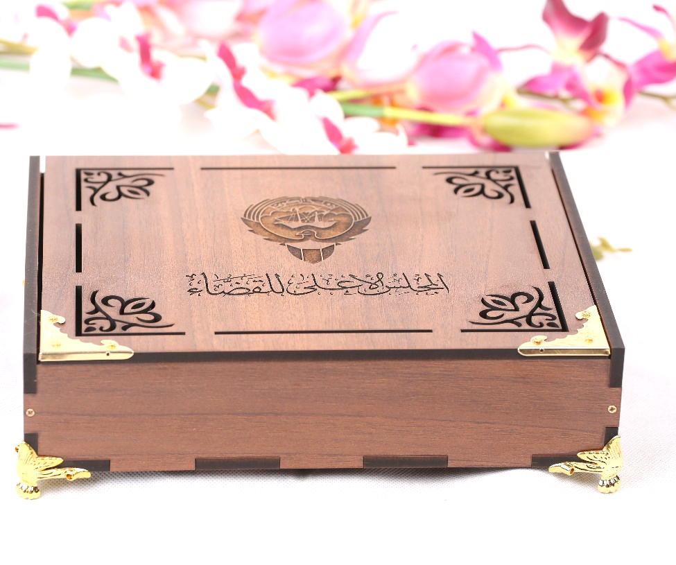 صندوق خشب مع قواعد وأطرف معدنية الطول 26سم العرض 20 سم الارتفاع 7,5 سم