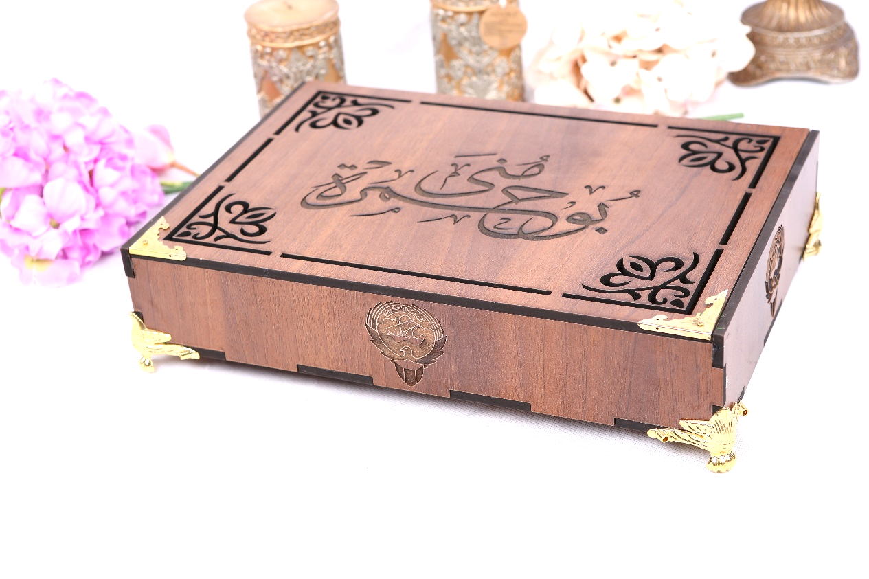 صندوق خشب مع قواعد وأطرف معدنية الطول37سم العرض 25 سم الارتفاع 9 سم