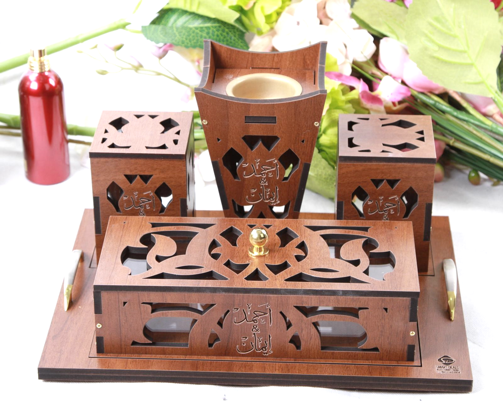 صينية مبخر خشب (الطول 34سم - عرض 25 سم) تحتوي على مبخر و علبتين بخور و علبة حلو
