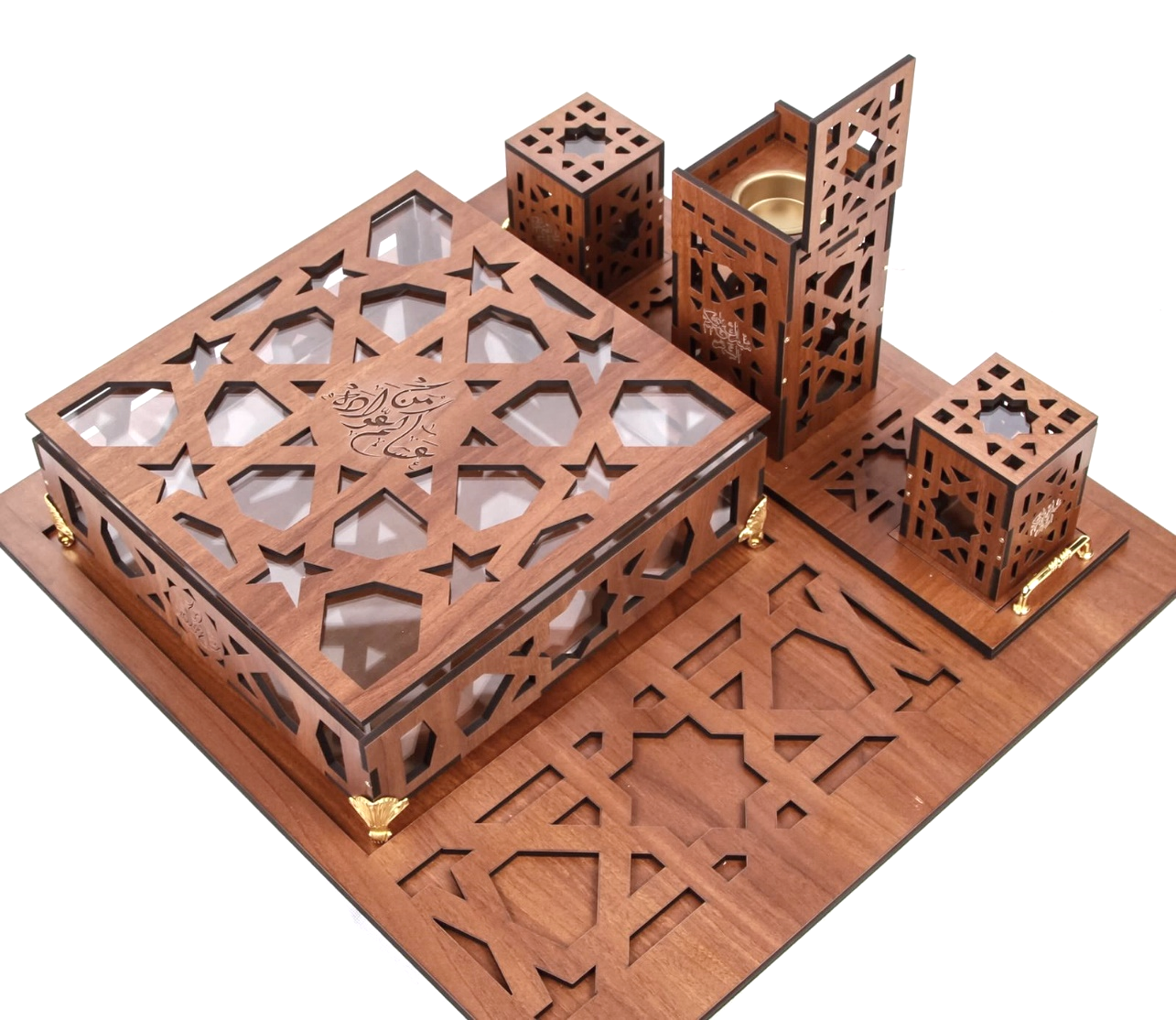 صينية خشب حجم كبير (طول 60 سم – عرض 56 سم) تحتوي على صندوق للحلو علبتين بخور ومبخر مع أمكانية حفر الأسماء على القطع