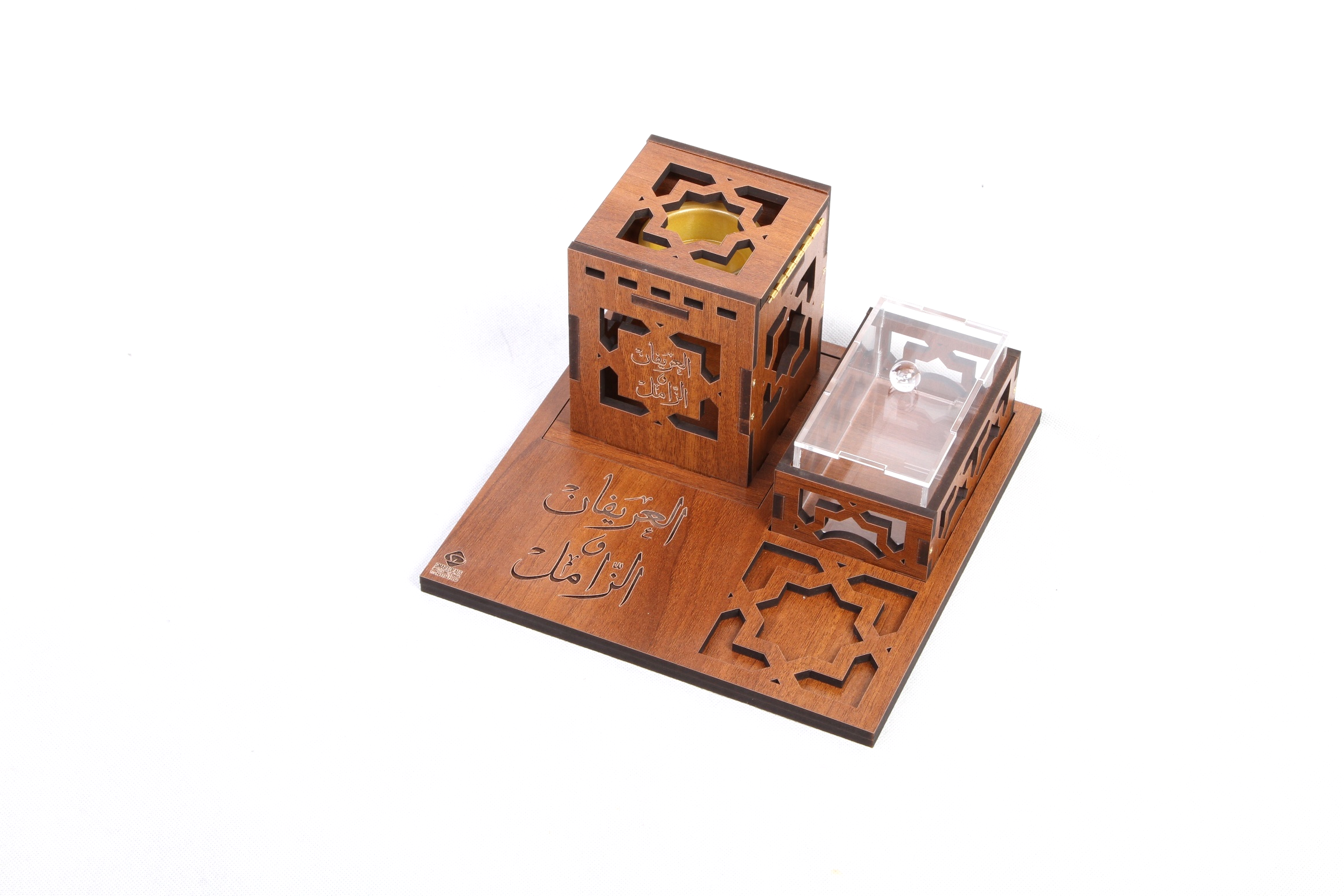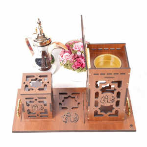 صينية مبخر(24*24 سم) تحتوي على مبخر(ارتفاع 13 سم) مع علبة للحلو او بخور مع أمكانية حفر الأسماء والعبارات