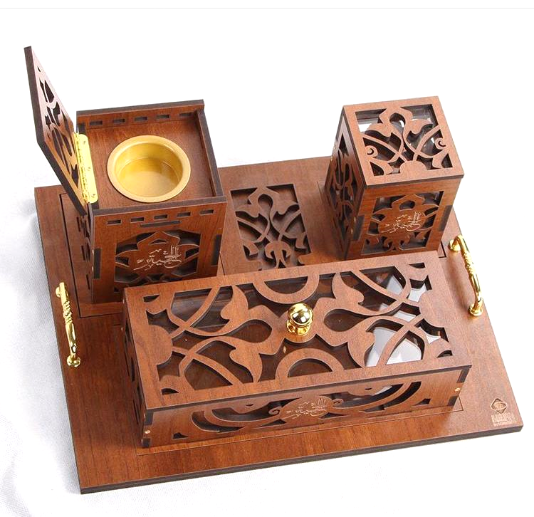 صينية خشب تحتوي على مبخر وعلبة بخور وعلبة حلو طول 35 سم عرض 28سم ارتفاع المبخر 13 سم . علبة الحلو (طول 26سم ، عرض 11 سم, ارتفاع 6,5 سم)
