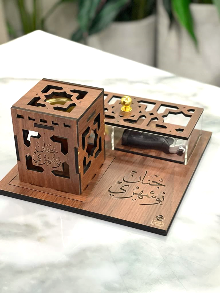 صينية مبخر طول 26 سم عرض 26 سم ارتفاع المبخر 13 سم كما تحتوي على صندوق يتضمن ولاعة