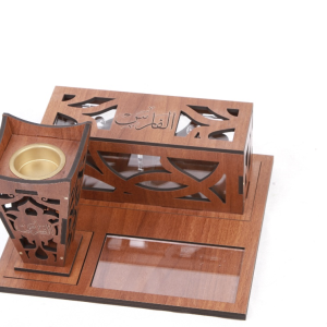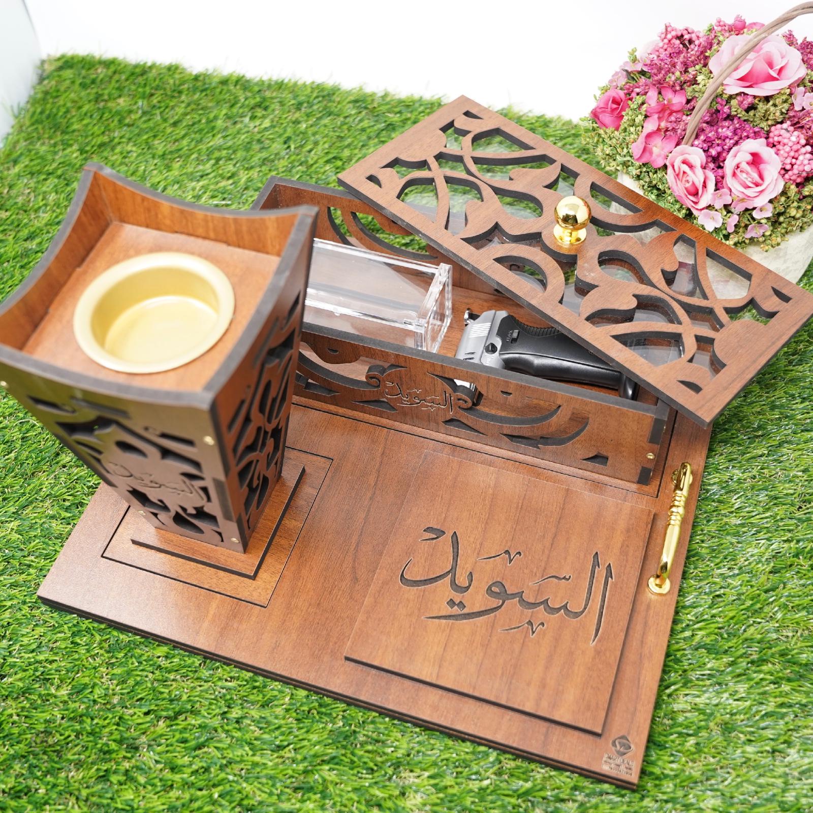 صينية مبخر (30 سم طول – 28 سم عرض) تحتوي على مبخر (ارتفاع المبخر 18 سم) وصندوق خشب بداخله علبه للبخور وولاعة مع أمكانية حفر الأسماء على القطع