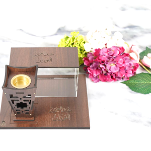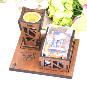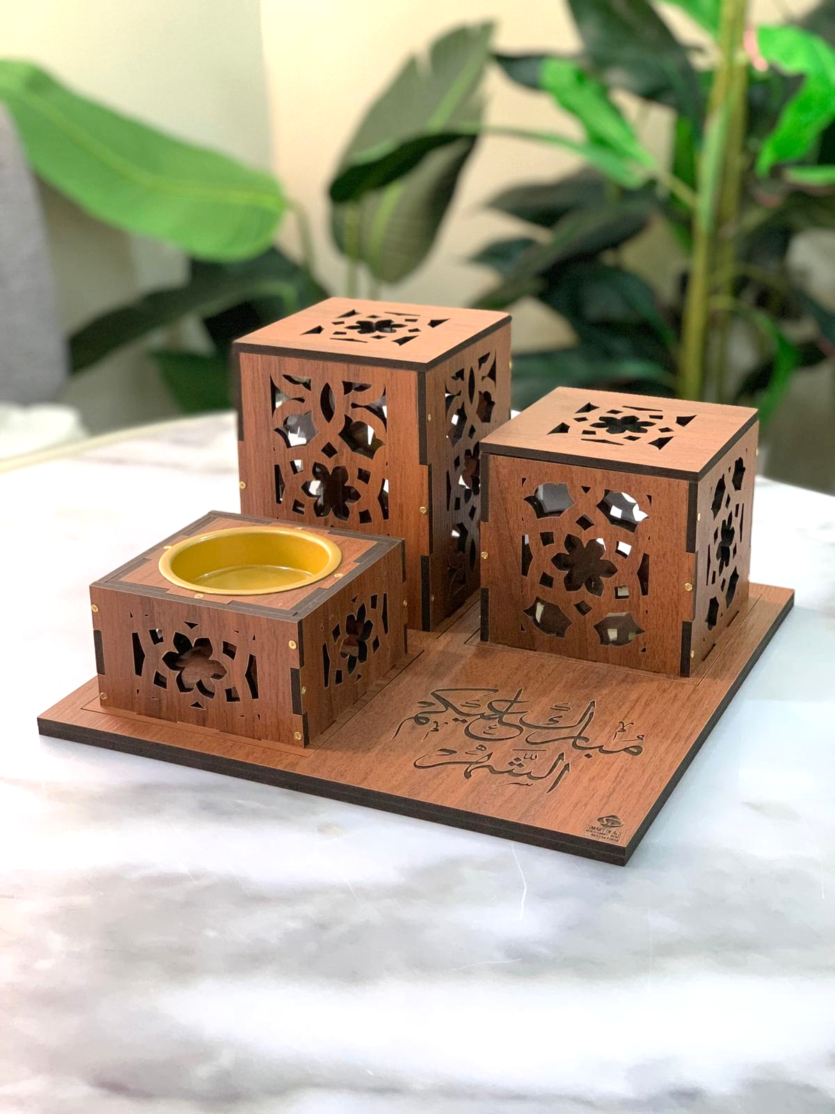 صينية خشب (طول 30,عرض 30) مع ثلاث علب (طول 12 سم – عرض 12 سم),ارتفاعات العلب (15, سم 11 سم, 7 سم) مع أمكانية استبدال العلبة الصغيرة بمبخر
