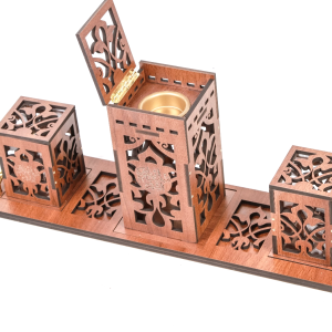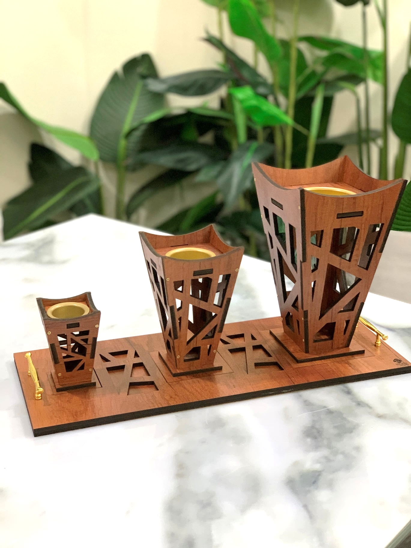 صينية مبخر خشب (طول 40 سم عرض 20 سم) مع ثلاث مباخر ارتفاع (المبخر الكبير 26 سم – الوسط 18 سم – الصغير 10 سم) مع أمكانية حفر الأسماء على القطع -