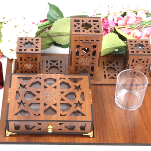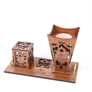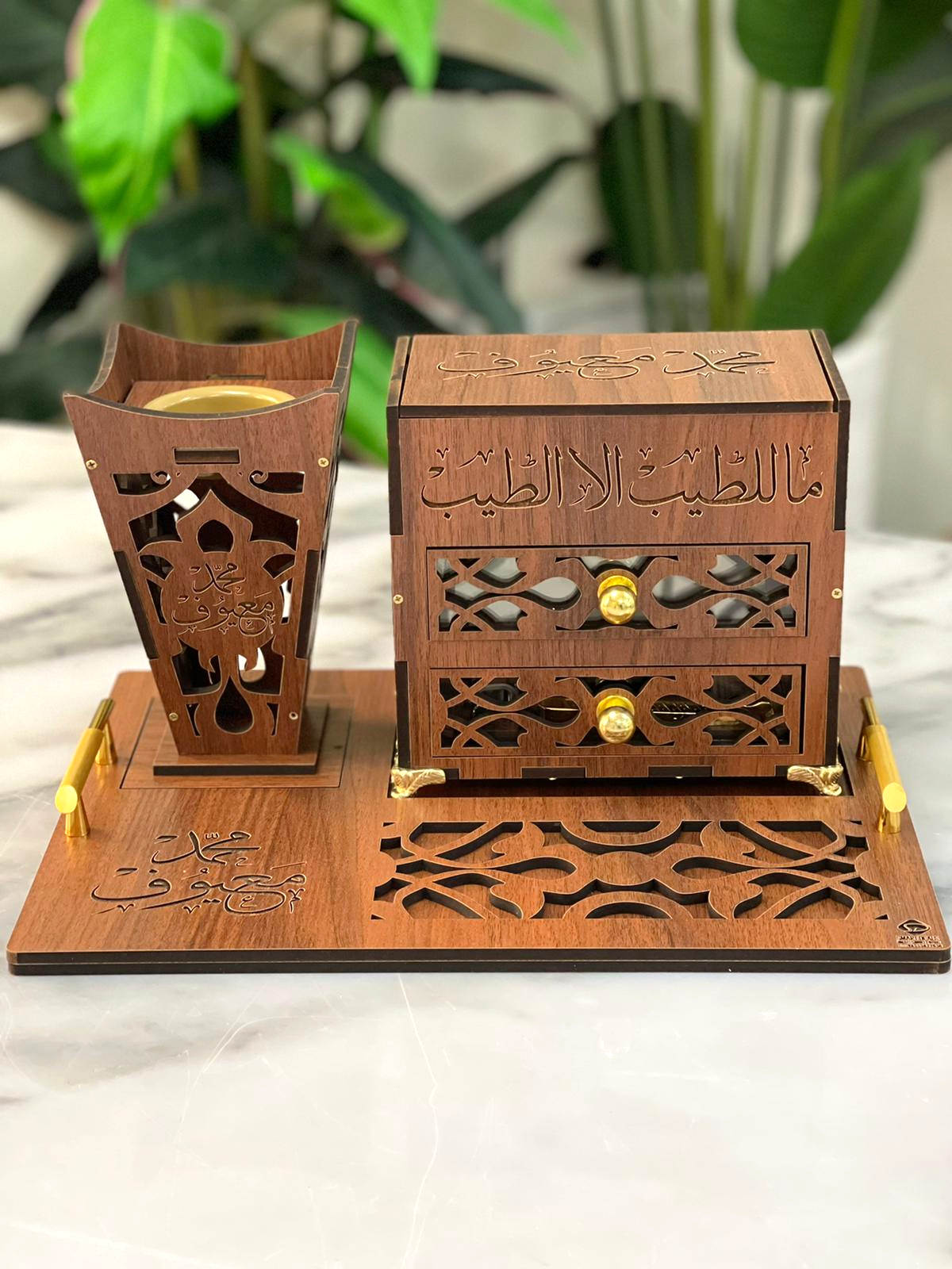 صينية خشب (طول 34 سم عرض 25 سم) تتضمن مبخر طاولة مع جرارتين يحتوي على ولاعة وملقط - (طول 18 سم - عرض 10سم ارتفاع 17سم) مح إمكانية حفر الأسماء والعبارات علك القطع