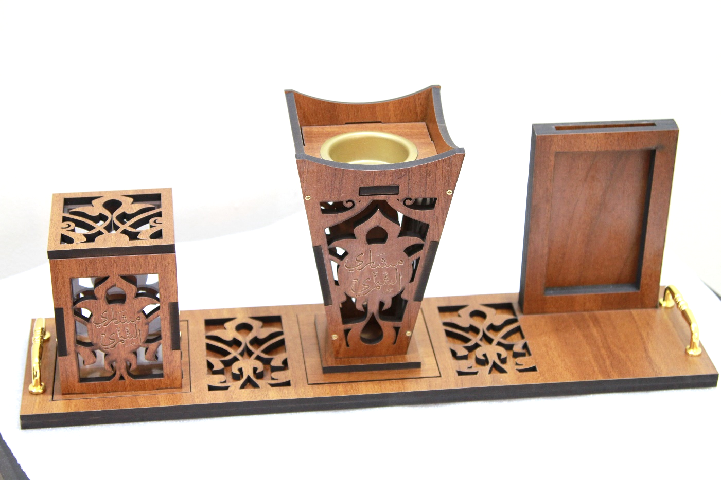 صينية خشب تحتوي على مبخر وبوكس بخور و برواز للصور . طول 47 سم عرض 12 سم مقاس البرواز 15 سم * 10 سم