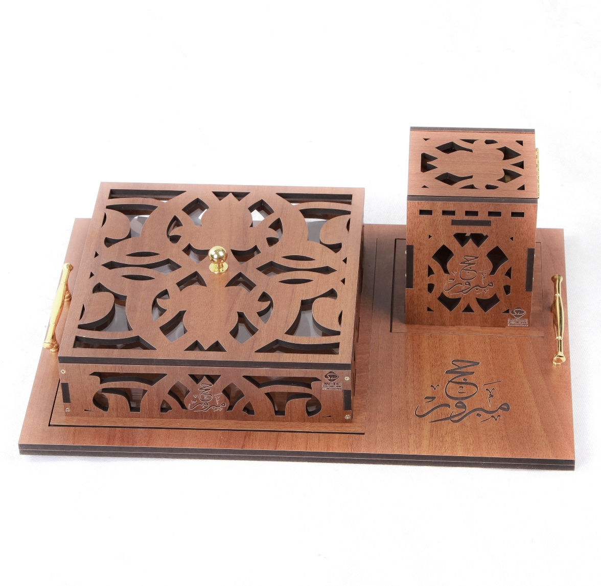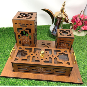صينية خشب (42 سم طول 29 سم عرض) تحتوي على درع(25 سم طول ارتفاع 20 سم) كما تحتوي على علبة خشب مع أمكانية حفر الأسماء على القطع