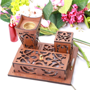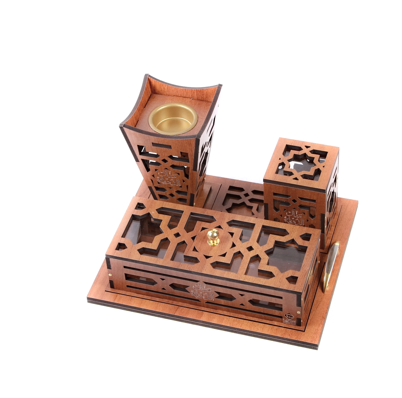 صينية خشب تحتوي على مبخر وعلبة بخور وعلبة حلو طول 30 سم عرض 25سم ارتفاع المبخر 18 سم . علبة الحلو (طول 26سم ، عرض 11 سم, ارتفاع 6,5 سم)
