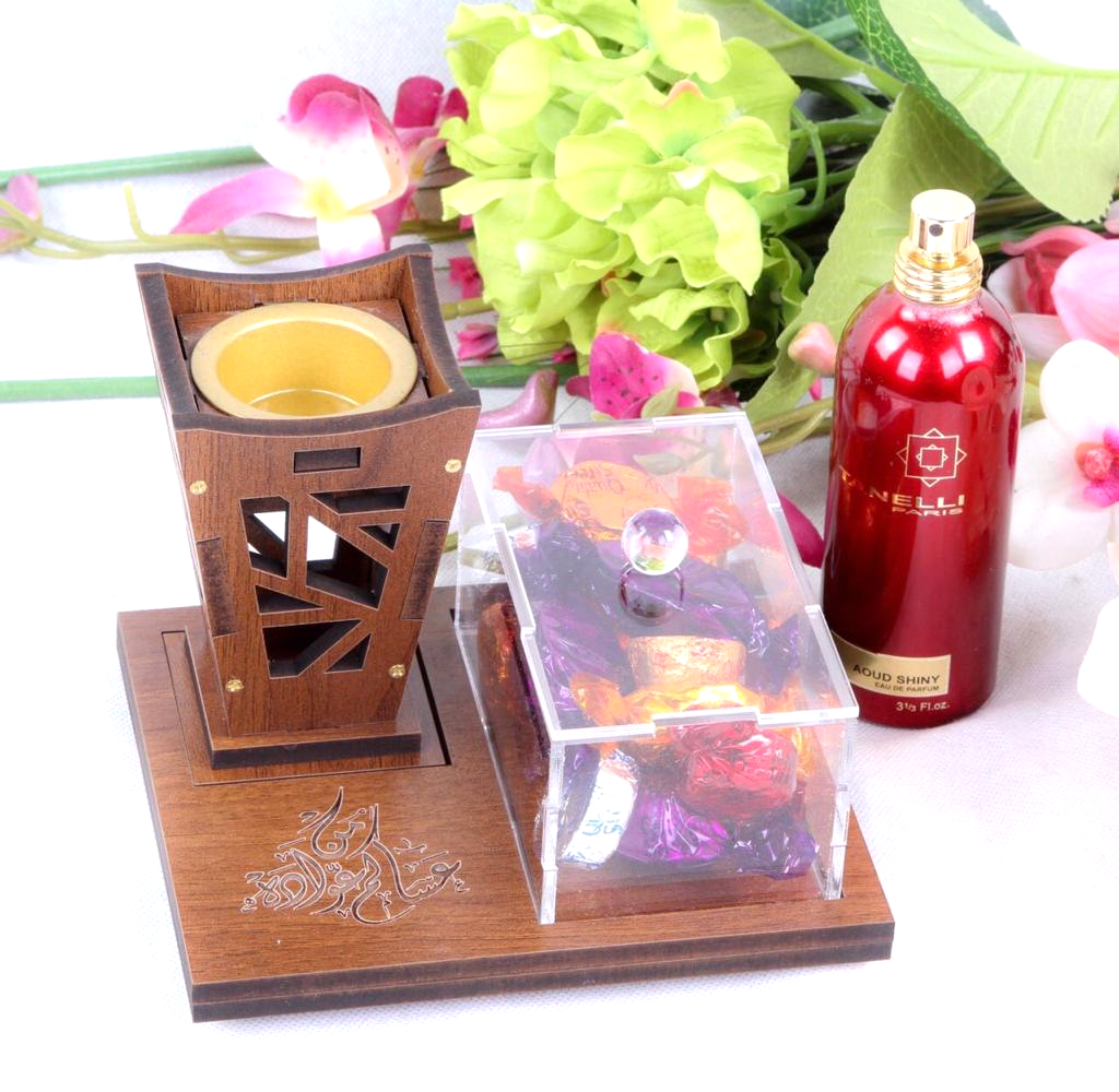 صينية مبخر مع علبة اكريلك للتوزيعات مع أمكانية حفر الأسماء ( طول 16* عرض 12 ) ارتفاع المبخر 10سم